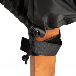 - Zabezpieczanie przed wiatrem: Pokrowiec został wyposażony w rozwiązania chroniące przed porwaniem przez wiatr. Ściągacz na sznurku, zakończony praktycznym stoperem, umożliwia szybkie i łatwe dopasowanie pokrowca, co zapobiega jego przemieszczaniu się nawet podczas silnych podmuchów. Dodatkowo specjalne paski zapinane na rzepy pozwalają solidnie owinąć nogi stołu lub krzeseł, co jeszcze bardziej stabilizuje pokrowiec, zapewniając meblom pełną ochronę przed niekorzystnymi warunkami atmosferycznymi.