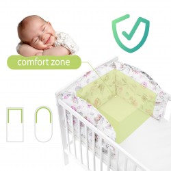 Dzięki trzem osobnym poduszkom o różnych wymiarach ochraniacz dopasowuje się do większości łóżeczek 120x60 cm i 140x70 cm. Długie troczki umożliwiają pewne mocowanie, a ozdobna falbanka i okrągłe przeszycia nadają całości dekoracyjnego wyglądu. Możliwość prania w 60°C ułatwia utrzymanie higieny, a certyfikat OEKO-TEX to gwarancja bezpieczeństwa dla najmłodszych.