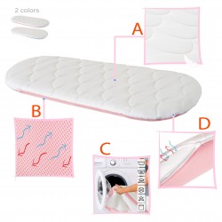 Materac dostępny jest w rozmiarze 76x32 cm, dlatego pasuje do większości popularnych modeli wózków dziecięcych. Dzięki swojej innowacyjnej budowie zapewnia optymalną cyrkulację powietrza, co pomaga utrzymać materac suchym i świeżym, jednocześnie chroniąc przed bakteriami, grzybami i roztoczami. Pokrowiec materaca można łatwo utrzymać w czystości, ponieważ można go prać w pralce w temperaturze 30°C, co gwarantuje higienę i świeżość bez wysiłku.