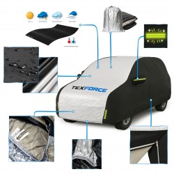 Pokrowiec TEXFORCE SUV to trwałe i funkcjonalne rozwiązanie dla kierowców, którzy chcą skutecznie zabezpieczyć swój samochód podczas postoju na zewnątrz – niezależnie od pory roku.