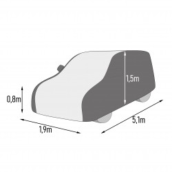 Dzięki dopasowanym wymiarom 510 × 190 × 150 cm pokrowiec przeznaczony jest do większości samochodów osobowych typu SUV, szczególnie większych modeli o długości do około 5,10 m. Elastyczna guma oraz taśmy mocujące do kół zapewniają stabilne przyleganie do nadwozia i zapobiegają zsuwaniu się pokrowca nawet przy silnym wietrze. Zamek błyskawiczny po stronie kierowcy umożliwia szybki dostęp do wnętrza pojazdu bez zdejmowania całej plandeki.