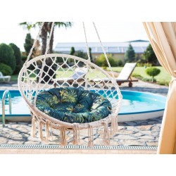 Troczki umożliwiają stabilne przymocowanie poduszki do konstrukcji huśtawki, a dekoracyjne przeszycia w stylu guzikowym nadają jej elegancki wygląd.